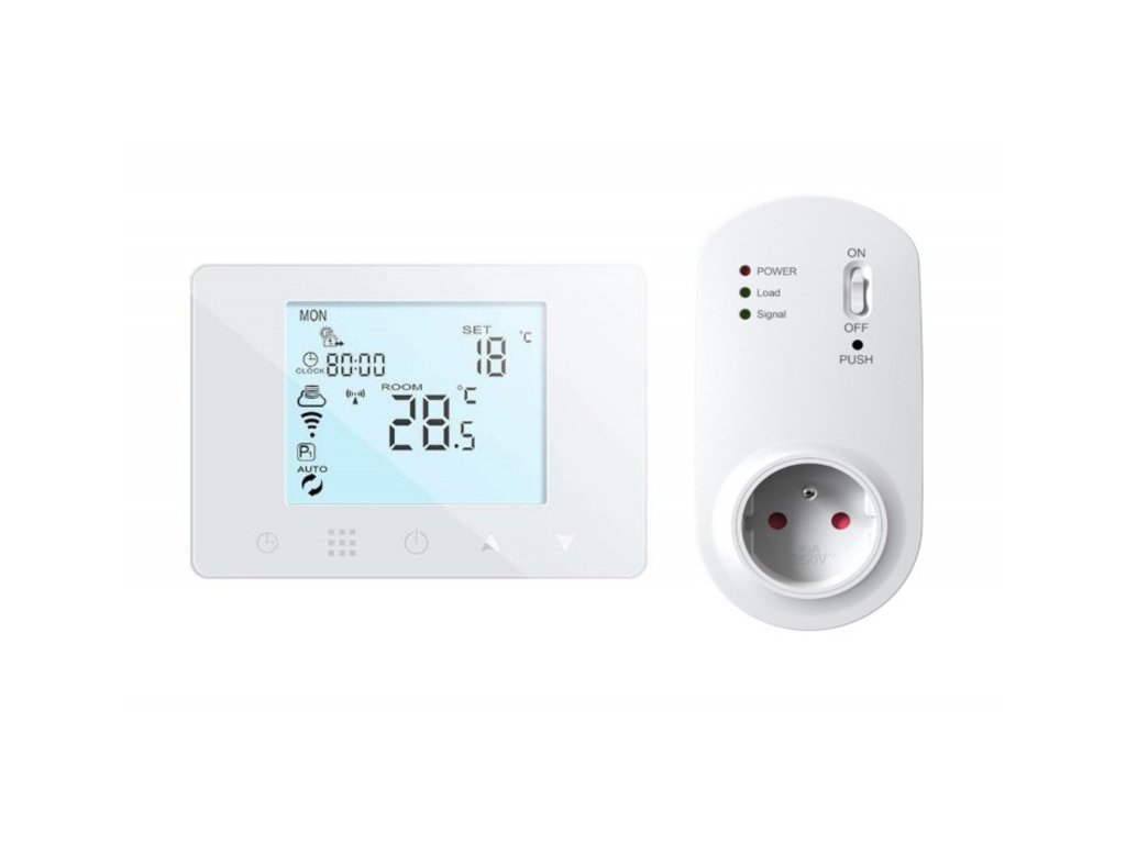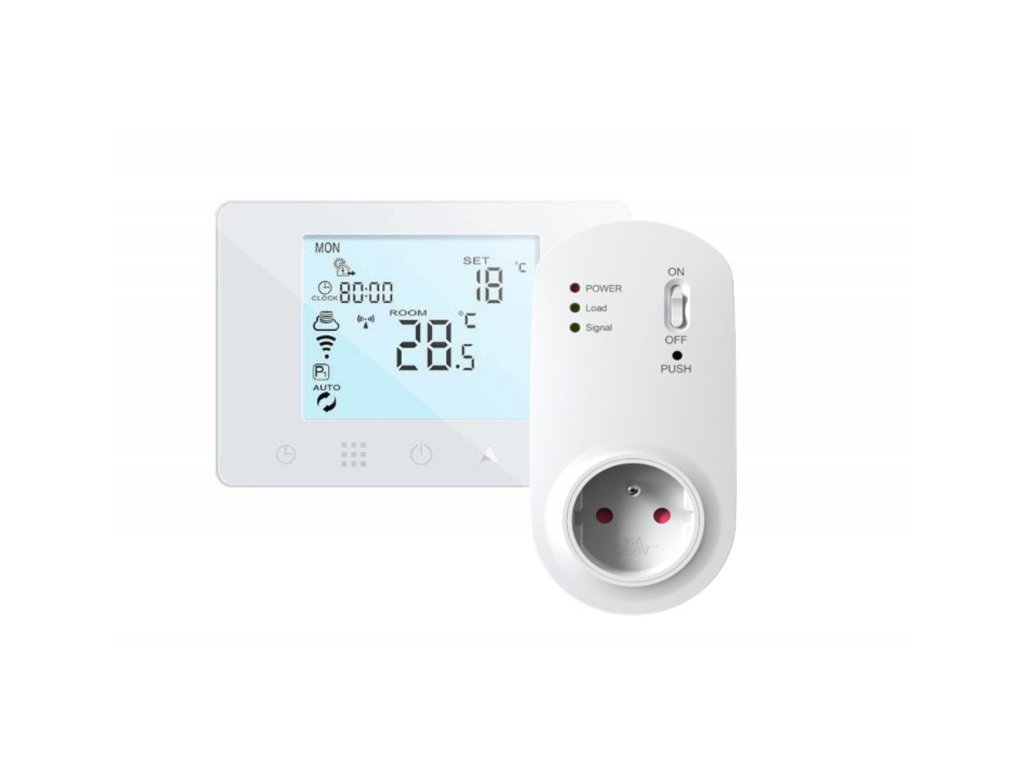 Bezdrátový týdenní termostat s přijímačem do zásuvky (spínaná zásuvka) a možností ovládání přes WiFi