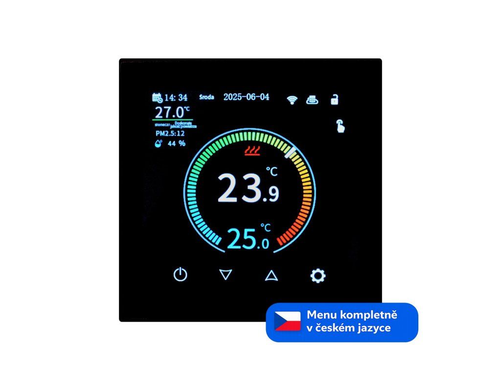 Drátový, dotykový termostat s týdenním programem a ovládáním přes WiFi, zapuštěná montáž, menu v češtině